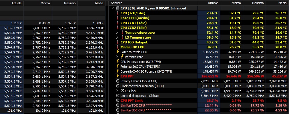 , il procio può performare di più della Fmax sia con carico 100% che ancor più con carichi inferiori, e quindi la Fmax è un paletto che va rimosso, e con il 9950X è 5,5GHz/5,550GHz nel 1° chiplet e 5,4/5,450GHz nel 2° chiplet.
