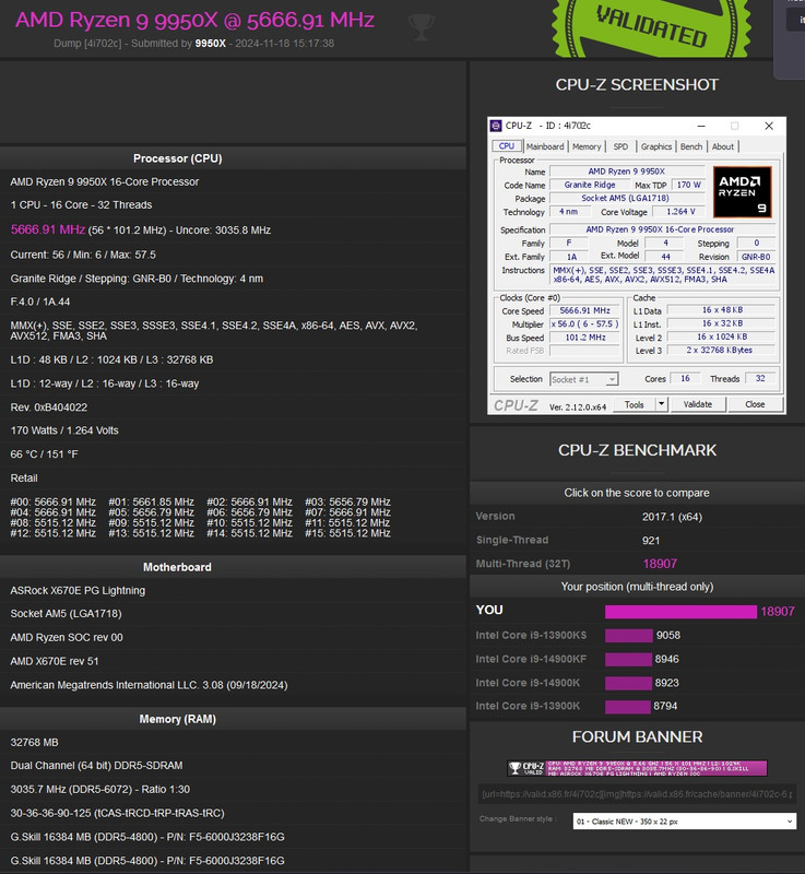 1° passo: tramite CO abbassare il Vcore richiesto... l'algoritmo assegnerà il Vcore "nuovo per la frequenza X. ------------------------ N.B. Il valore max CO negativo è ottenibile con Override a 0. Incrementando l'Override, da 0 a +200MHz, ridurrà il valore CO negativo possibile. E' un cane che si morde la coda... perchè la frequenza massima la si ottiene con il minimo Vcore (e quindi con CO più spinto possibile), quindi si arriva ad un punto che un Override troppo spinto con CO poco spinto potrebbe ottenere una frequenza inferiore rispetto ad un Override inferiore ma un CO molto spinto. ------------------------ L'OC del BUS (def 100MHz) per me è preferibile all'Override, specialmente con mobo con generatore di clock esterno. Nel mio sistema se applico un Override +100MHz, devo abbassare il valore massimo CO, mentre se porto il bus a 102MHz, non sono costretto ad abbassare il CO ma ottengo ugualmente i +100MHz che concederebbe un Override a +100MHz. L'unica spiegazione che trovo, è che l'algoritmo associ il Vcore (- CO) alla frequenza reale (moltiplicatore * frequenza bus aumentata) e si "adatti", mentre l'Override forza una frequenza superiore a quello che l'algoritmo elabora (Vcore (-CO) * frequenza ("normale" senza OC BUS)). L'OC del BUS è utile in MT, perchè Zen5 ha una Fmax a prescindere da Vcore/TDC/EDC/PPT/temp CPU. C'era anche in Zen4, ma siccome il 5nm non permetteva frequenze alte, di fatto non si notava perchè l'Fmax limitava frequenze più alte di quelle massime ottenibili. Qui c'è da aggiungere un punto: L'algoritmo assegna il Vcore oltre che alla frequenza/carico, anche in base alla temperatura del core. Io ho constatato che con AIO 420, tra Tamb 30°+ e Tamb 10°, c'è una differenza di ben 0,13V, cioè si passa da 1,4V (HWinfo) per 5,7GHz, a 1,27V (HWinfo). Questo fa si che d'estate il limite imposto di 5,55GHz dalla Fmax non incide... avremmo un 9950X suppergiù a 82° per 5,4GHz, ma d'inverno ci ritroveremmo limitati dalla Fmax con temp CPU <82° a 5,550GHz. --- P.S. L'ultimo OC l'ho fatto con CO -50 e bus 101.25MHz. Non ero limitato dalla Fmax (forse in CPU-Z, visto che sono arrivato a 5,666GHz che è l'esatto risultato di 55,5X * 101.25), ma dalla temp CPU. Questo lo capisci, a prescindere dalla temp CPU rilevata da HWinfo (che non ho guardato), se fai 2 run consecutivi di CB23/CB24, se il 2° performa un risultato inferiore, è ovvio che sia per la temp. Ho fatto le mie prove con BUS a 102MHz, lo passo... aspetto solamente una botta di freddo 0° e dovrei avere margine per ulteriori +50MHz, forse + 100MHz (55,5X * 102MHz BUS = 5,661GHz).