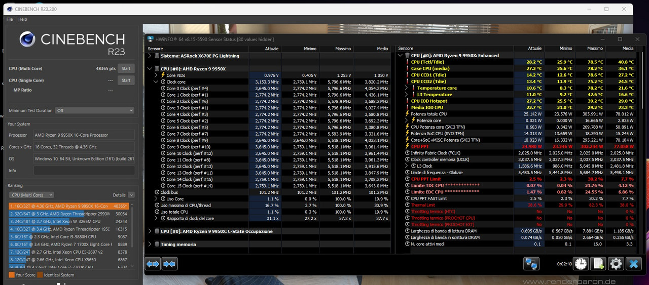 Allora... usando priorità in tempo reale (solo con CB24, CB23 lo lascio normale), HWinfo non rileva bene... ma sono sempre sui 300W/303W. Con tamb più basse riesco ad abbassare il Vcore a pari frequenza e quindi a pari Vcore frequenze più alte... i Watt rimangono sempre quelli. In realtà non abbasso il Vcore... una volta arrivato a CO -50, di più non c'è, è l'algoritmo che lo imposta più basso perchè lo fa in base alla temp CPU. A 10°, 300W, con Tamb 10° sono arrivato a 82/85° di temp CPU... ormai sono 1,28V massimi per CB24/CB23. Il consumo totale sarà 30W in più al max... ho 32GB DDR5 a 1,3V, max 10W, il case l'ho smembrato perchè il 420 dentro non ci sta... quindi ho case aperto con 1 ventola sulla dissipazione VRM ed un'altra sul 2° chip-set, di VGA uso l'integrata nella CPU, il resto è un SSD da 1TB economico... va beh, la pompa e le 3 ventole dell'AIO. Comunque niente di che... da quello che leggo in giro, il 9950X fa 48.000 a CB23 con un custom buono... io con l'AIO li faccio per una Tamb inferiore. Questo perchè avere la CPU più fredda possibile (Custom vs AIO), è già di suo una sorta di CO negativo.