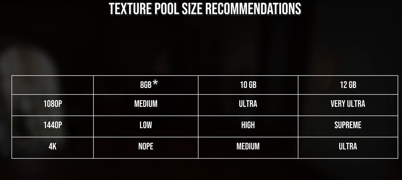 Nel video di Digital Foundry Battaglia ha fatto una tabella con le impostazioni delle texture da utilizzare sulle varie schede e nella sezione 8GB 4k c'è scritto "nope".