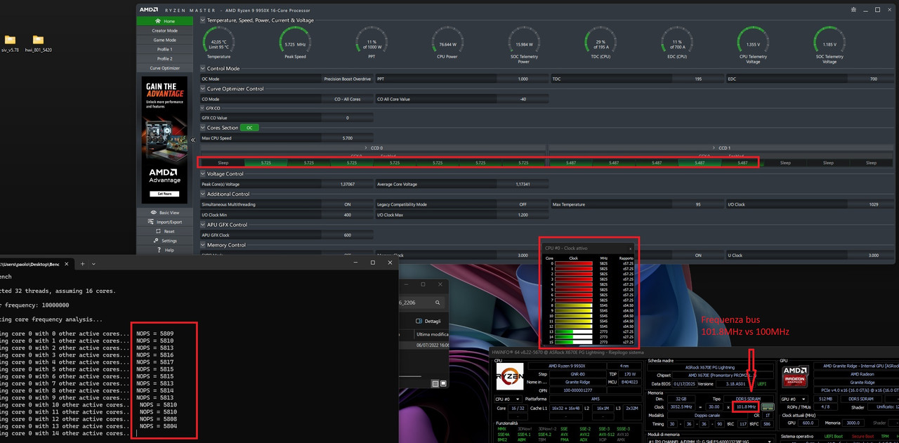 ![]() Praticamente, le frequenze dei core sono valutate tramite il moltiplicatore supponendo una frequenza del bus a 100MHz. Se si occa il bus >100MHz, la frequenza che riporta Rayzen Master rimane sempre la stessa. La schermata postata sopra è la medesima da un bus 100MHz fino a 102.5MHz... e l'errore viene riportato anche nella rilevazione del clock DDR5. Stranamente HWinfo ed altri rilevano tutto giusto. Che poi sono le discrepanze rilevate con quel 9950X3D. Per un 9950X, Ryzen Master riporta un valore di frequenza calcolato e non rilevato, perchè si basa sul molti di 57X per il 1° chiplet e 54.5X per il 2° chiplet, che su base Bus 100MHz corrisponderebbero 5,7GHz per il 1° Chiplet e 5,450GHz per il 2°. Se si guarda il molti su HWinfo, che è 57.25X, va a pennello con 5,725GHz. A prescindere dalla frequenza del bus, invece viene sempre rilevato 5,724GHz per il 1° chiplet e 5,481GHz per il 2°). Personalmente io ho sempore utilizzato Ryzen Master perchè rileva (rilevava a sto punto) meglio la frequenza effettiva.