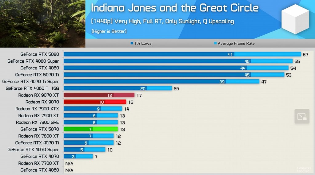 Cmq qualcuno mi spieghi perchè la 4070ti e la 5070 fanno 12 e 13 fps , la 9070xt 17 fps e la 4060ti 26 fps è per via dei 16 giga delle nvidia , perchè quelle da 12 gb vanno sotto un treno , ma quindi vogliamo dire che indiana jones in RT è programmato col cu.. , male ?