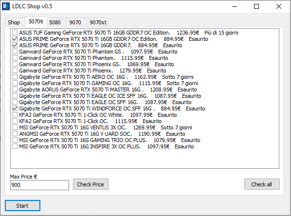 ho cercato di migliorarlo un pò, tolto la notifica via mail per non andare ad impellagarmi su problemi di sicurezza, trasparenza e dati sensibili ovviamente essendo il mio target una 5090 ho escluso il check su queste schede mi perdonerete appena riuscirò a prenderne una aggiungero il check anche per quelle cmq controlla le 5070ti e le 5080, basta spuntare la scheda che si vuol tenere sott'occhio e quando disponibile apre il browser sulla pagina e fa la musica di super mario ho fatto tutto velocemente, spero non ci siano problemi https://www.mediafire.com/file/t2shp...lc_05.rar/file