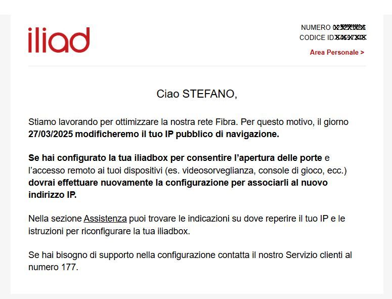 ![]() Parlano solo di cambiare IP pubblico (e mi giunge un po' strana questa cosa, visto tanto l'ip assegnato non è da contratto fisso, quindi potrebbero anche farlo senza dire niente a nessuno...) e non di porte. Però poi la guida la danno sulle porte, che se è configurazione interna non ha senso modificare. Infine segnalo che (se è corretto l'ID in alto a destra, che qua ho oscurato) si tratta di una linea fibra che ho disdetto qualche mese fa, con tanto di ritiro iliadbox andato a buon fine. Boh. NOTA: il link ASSISTENZA atterra qua: https://assistenza.iliad.it/privati/...razione-porte/
