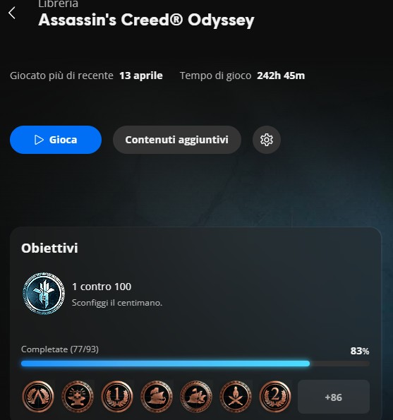 Sto giocando ad Assassin's Creed Brotherhood su Ubisoft Connect e mi chiedevo: c'è un modo per vedere la lista degli achievement già sbloccati e quelli mancanti? Il gioco mi segnala quando ne ottengo uno, ma non riesco a trovare da nessuna parte la schermata con l'elenco completo. Grazie in anticipo! |