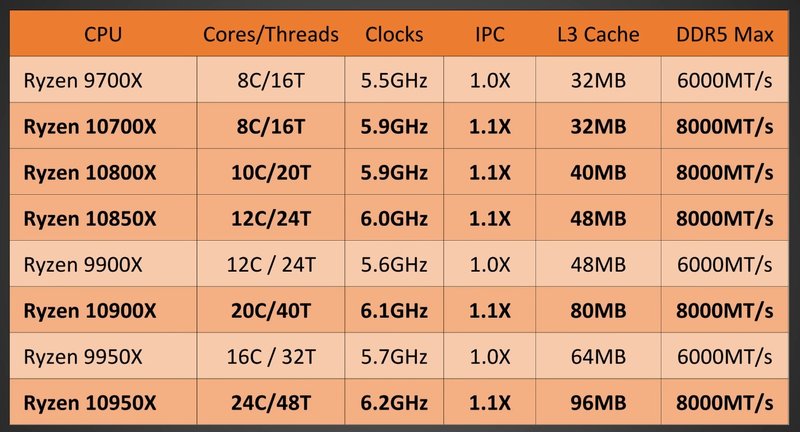 Vedere il 10700x a 8 core, fa pensare che il 10600x rimanga con 6 Tra l'altro con ccd da 12 core, devi impegnarti per far uscire un 6 core. Anche l'assenza di un 16 core è piuttosto ambigua. Onestamente con un incremento del 50% della densità, come minimo mi aspetto che il 10600x abbia le specifiche del 10700x riportato...