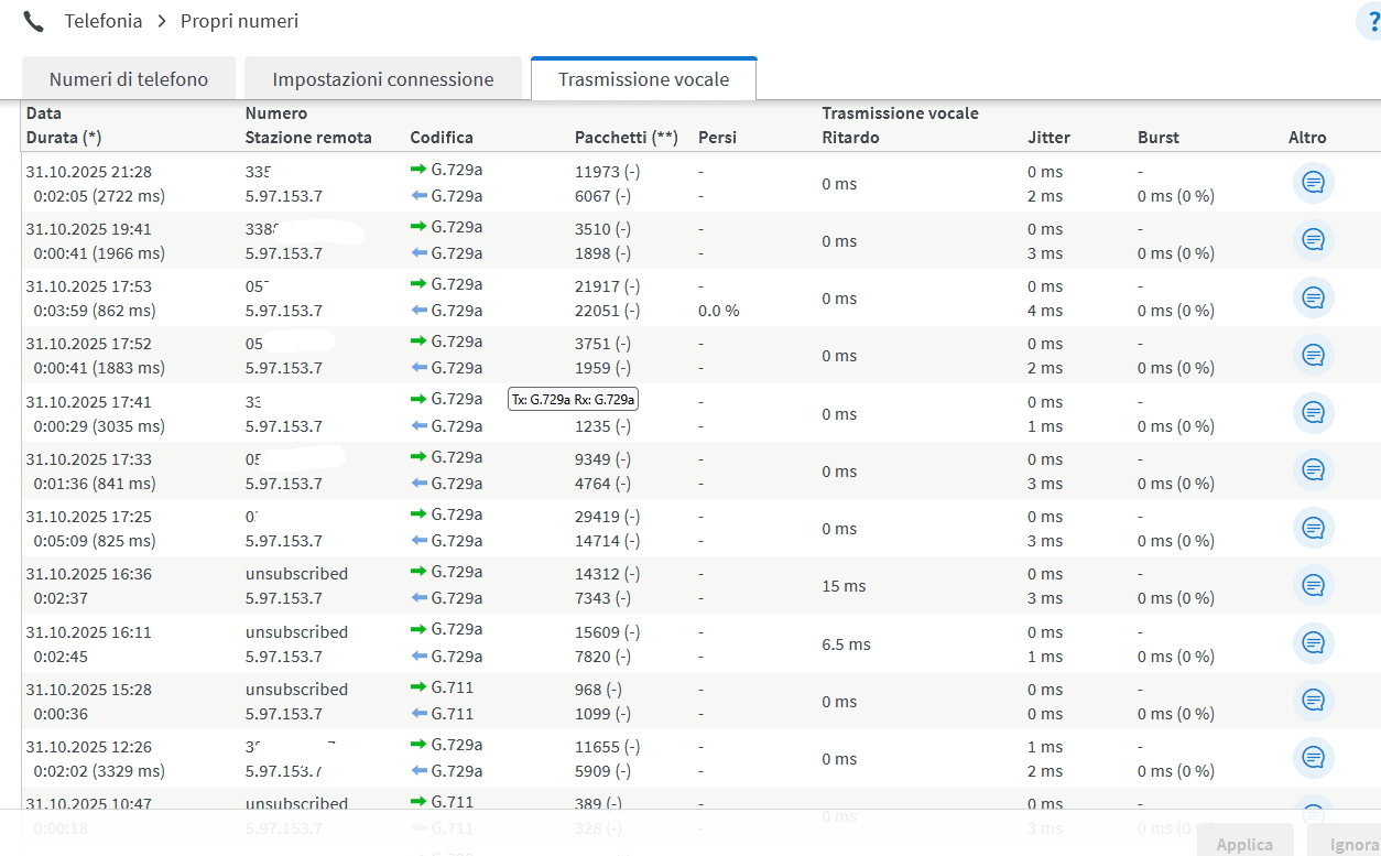 Oggi appunto entro nel registro chiamate, perchè ho ricevuto una telefonata anomala... e noto che le chiamate in entrata sono tutte Unsubscribed Io ho una FTTH TIM in casa ho la ONT e con il cavo di rete entro nel Fritz. TIM dovrebbe prevedere di default il Caller ID, ma il mio 6850 scorrendo indietro non visualizza alcun numero entrante. Vero è che ho la versione 7.57, tutto funziona non mi sono interessato a mettere manualmente la 8.20 ma immagino di poterlo fare senza perdere nulla, giusto ? MA il problema attuale prima, è capire perchè non vedo il numero entrante. Nelle impostazioni è spuntato modalità semplice, ma nemmeno su avanzato vedo niente. Noto alcune chiamate codificate G729a e alcune G711.. ma ne l'uno ne l'altro visualizza il numero. I numeri che erano visibili nello screen qui sotto, erano le uscenti.. e le ho opportunamente oscurate. Per me potrebbe essere sufficente vedere i numeri nel registro chiamate... Che mi consigliate ??
