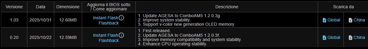 AMD parla di +70% su Epyc, ed intende a parità di PPT. Interpretando i valori PPT dei prossimi modelli Epyc, si nota che il PPT aumenta maggiormente rispetto all'aumento del core count (450W Epyc Xen5 --> Epyc Zen6 +50% di core ma PPT + 55,5%) siccome AMD ha via via commercializzato EPYC con efficienza uguale o migliore, se ne dedurrebbe che un Epyc Zen6 con +10% di PPT ottenga una efficienza uguale o migliore rispetto a Zen5. Quindi... ribaltandolo sul desktop, avremmo che a parità di consumo un X24 Zen6 risulterebbe +70% prestazionale (in MT) con una efficienza migliore, ma anche che a parità di efficienza avremmo un +87% di prestazione in più. Per giunta sarebbe anche per difetto, in quanto l'N2P ha frequenze massime superiori all'N4P, quindi è palese che avrà uno scalign migliore sull'aumento di frequenza vs consumo. In OC dovrebbe essere mostruoso... in quanto con il +50% di core, se l'N2P rispecchiasse l'N4P, considerando che il 9950X da 200W PPT def regge fino a 350W, l'X24 Zen6 potrebbe arrivare a 500W in OC. In ogni caso è certo che sia maggiore di 350W... si potrebbe arrivare a 90.000 a CB23. Poverino il mio AIO 420 ----------------------------- Non è che stanno distribuendo bios con supporto Zen6 "mascherati"? ![]() ![]() In sintesi... l'aggiunta di "Supporto V-color new generation OLED memory" sul bios della Taichi OCF, aumenta la dimensione di 10KB. Nella Taichi e Taichi Lite, quasi 2,7MB. Un aumento così corposo, è sullo stile dell'aumento visto sui bios che dal solo supporto Zen4 passavano al supporto Zen4 + Zen5. In più, l'aggiungere solamente quel supporto, comporta la variazione del numero major di serie... e che senso avrebbe divulgare un BIOS beta per il supporto alle OLED memory? EDIT Niente... supporto nuovi 3D e altro.