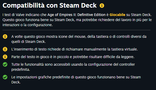 Però il fatto che non ci sia il logo Steam non vuole necessariamente dire che su SteamOS non funzioni, perché può funzionare tramite Proton. Per appurare ciò credo che il modo migliore sia controllare la compatibilità con Steam Deck. Nello specifico per Age of Empire 2 Definitive Edition la compatibilità con Steam Deck è classificata come "giocabile" quindi si avvia su SteamOS/Linux. Guardando i dettagli troviamo che: ![]() Tutti i punti gialli riguardano interfaccia e controlli che potrebbero risultare scomodo su Steam Deck in quanto affarino portatile, quindi su un pc con monitor, tastiera e mouse mi aspetto che funzioni alla grande. |