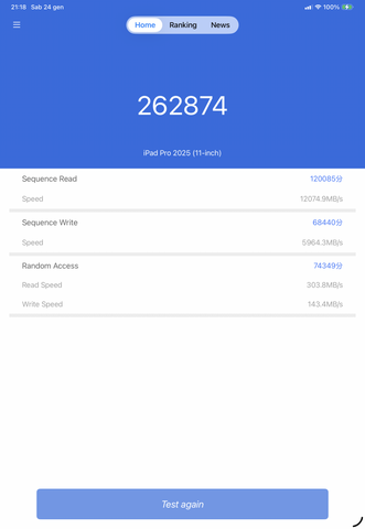Copia e sposta 100gb di dati da un SSD esterno. Nella versione 256gb ci ha impiegato 3 minuti e 40 secondi per copiare 100gb e 3 minuti e 45 per spostare sull'SSD esterno i 100gb. Nella versione 512gb ci ha impiegato 1 minuto e 40 secondi per copiare e 1 minuto e 42 secondi per spostare. Nell'iPad Pro M5 ci sono veluti 38 secondi. |