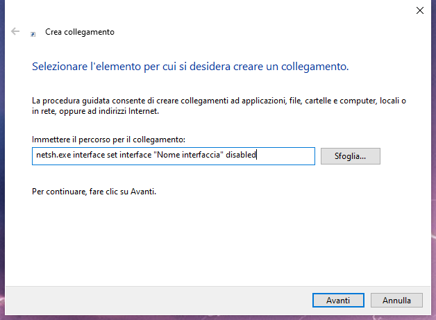 Per riattivare la scheda di rete basta o manualmente andare in Gestione dispositivi, o creare un altro link come sopra ma mettendo alla fine del comando enabled invece di disabled