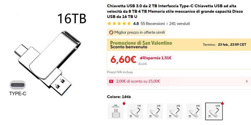 all'epoca c'erano quelle da 1Tb che erano "il massimo". Pagata pochi euro, aveva in dotazione anche l' adattatore usb->microusb e quello usb->usb-c. Ovviamente si fermava ben prima del Terabyte, se non ricordo male alla fine era da 256Mb che sarebbero anche stati utili, ma dopo qualche scrittura è morta completamente. Rimborso senza problemi, alla fine ci ho guadagnato i 2 adattatori !