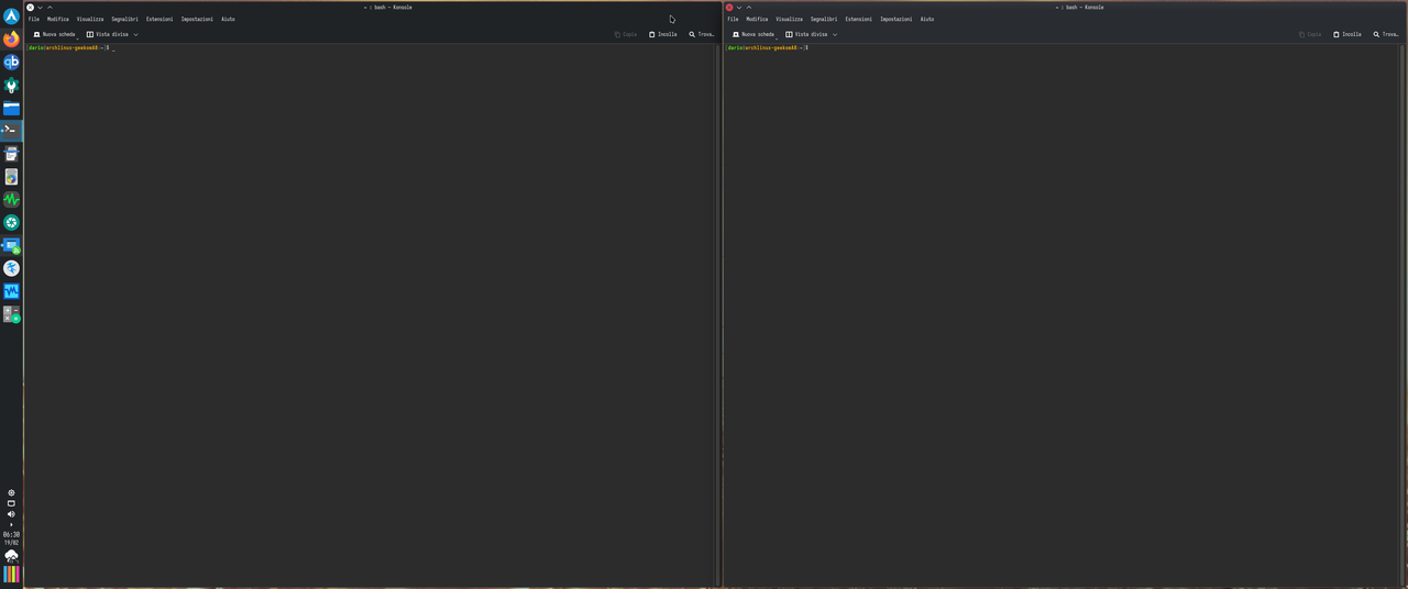 mettendola in basso (o in alto) mi mangerei dello spazio inutilmente. tutte le applicazioni che uso sono già sulla barra e utilizzo il "Tiling" integrato di Plasma per avere 2 o piu finestre sullo stessa schermata.