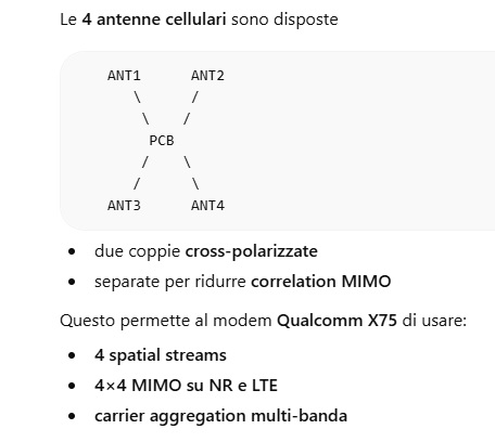 la prima su tutte è la versione release 3GPP, avevo già fatto uno specchietto l'anno scorso quando nessuno parlava di questo nell'altro thread ma non sono riuscito a recuperarlo, comunque semplicisticamente rel 15 --> NR base rel 16 --> NR CA evoluta rel 17 --> uplink CA migliorato rel 18 --> 5G A (advanced) la 5CA NR in sostanza viene supportata pienamente e sfruttata da rel 17 in poi, per non parlare delle combo possibili, che a volte sui vari forum si scatenano discussioni appassionate sul tal nuovo router che permette o non permette, a me funziona a me no... ma con wind sì e con vodafone no... ecc ecc... non voglio dare dell'ignorante a nessuno per carità, lo sono io per primo se non leggo le specifiche, però a volte le cose sono più semplici di quanto può sembrare senza fare tante prove e test o pensare di fare da cavia altra ragione, il modem dei X75 ha migliaia di possibili combo, ma alla fine si deve sempre inchinare a sua maestà firmware, questo dipende dalle certificazioni che ha, dalle antenne (troppo sottovalutate spesso mentre è un elemento fondamentale del router, sia indoor che outdoor) e dal mercato (EU CN US), in sostanza due router con lo stesso X75 possono avere CA e combo completamente diverse in conclusione, CA e combo di un router, dipendono da release 3GPP (specie se nativa), dal firmware del modem (non ne parliamo se è brandizzato), e dalle combo abilitate dal produttore. Come se non bastasse tutto ciò, poi ci sono anche le impostazioni delle singole bts, ma queste devono venire prese in considerazione alla fine di tutto Quote: