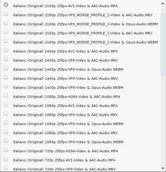 Se invece scarichi un video datato con risoluzione massima contenuta, es. 480p, molto probabilmente ti ritrovi un video .mp4 o .mkv. es. se usi questa stringa: yt-dlp -f "bv*[ext=mp4]+ba[ext=m4a]/b[ext=mp4]" <URL> puoi forzare il download con estensione .mp4 con audio m4a/aac e miglior codec video. Comunque con un download manager è diverso, es. se passo a jdownloader il link di un video a caso caricato ieri su youtube vedo: ![]() con le opzioni che calano fino alla risoluzione 144p e posso scegliere esattamente quale versione scaricare. |