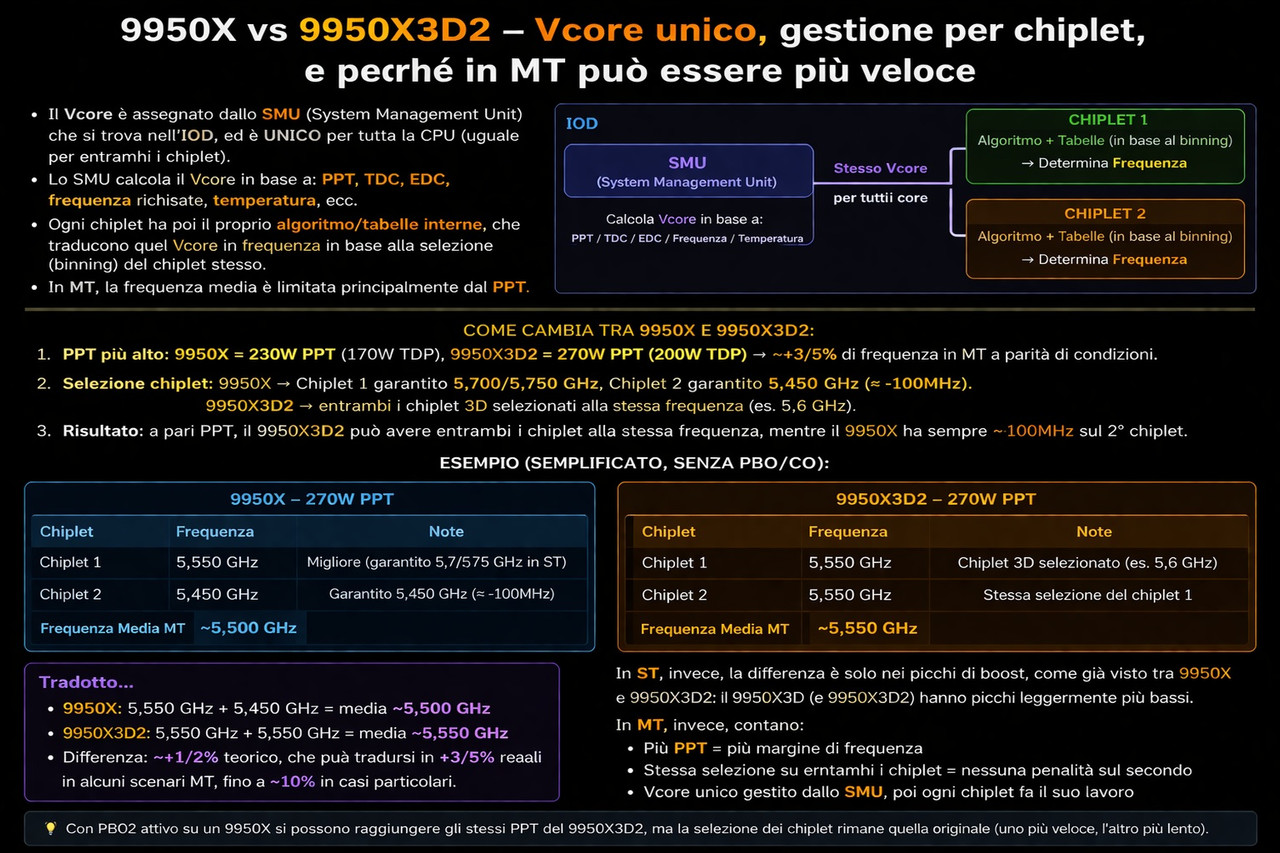 La differenza di frequenza tra liscio e 3D è solamente in ST. In MT la frequenza (media) dipende dal PPT, e il 9950X3D2 ha un TDP di 200W (270W PPT) vs i 170W TDP (230W PPT) del 9950X/9950X3D. Io ricordo che il mio 9950X a def non superava 200W PPT (inferiore al nominale che dovrebbe essere 230W PPT). Tra 200W PPT e ~270W PPT ci sono pressappoco 200MHz di differenza... il che si tradurrebbe un un +3/+5% di frequenza maggiore per il 9950X3D2. Ovviamente, su un 9950X, basterebbe attivare il PBO2 per arrivare agli stessi PPT del 9950X3D2... ma c'è un altro punto che può far performare di più il 9950X3D2, la selezione dei chiplet. Il 9950X ha il 1° chiplet garantito per 5,700/5,750GHz su tutti i core, vs il 2° chiplet che è garantito 5,450GHz. Il 9950X3D2 dovrebbe avere la stessa selezione di chiplet del 9850X3D, ovvero 5,6GHz, ma potrebbe essere su entrambi i chiplet. Senza tirare in ballo il CO, altrimenti si incasina il discorso, il Vcore viene assegnato dal SMU (System Management Unit) che è dentro all'IOD, in base a PPT/TDC/EDC/Frequenza/temperatura CPU, ed è LO STESSO per entrambi i chiplet. Poi subentra l'algoritmo dentro al chiplet (che ha una sua tabella specifica in base alla selezione) che si traduce in frequenza. Esempio (di massima), 1,3V Vcore, 9950X, Chiplet 1 5,4GHz, chiplet 2 5,3GHz Se il 9950X3D2 avesse i chiplet 3D della medesima selezione, si potrebbe avere: 1,3V Vcore, Chiplet 1 e chiplet 2 alla medesima frequenza, ovvero 5,4GHz + 5,4GHz e non 5,4GHZ e -100MHz sul 2° chiplet come nel 9950X. Quindi avremmo che il 9950X, anche se il 1° chiplet è garantito 5,7/5,750GHz, questa frequenza varrebbe solamente in condizione ST (a meno che non portare il PPT a >350W), e a pari PPT, potremmo avere che il 9950X3D2 potrebbe garantire una frequenza MT del 2° chiplet uguale al 1°, e non ~-100MHz come nel 9950X. Tradotto... 9950X 270W PPT, 5,550GHz sul 1° chiplet, 5,450GHz sul 2° chiplet, = media 5,5GHz. 9950X3D2 270W PPY, 5,550GHz sul 1° chiplet, stessa frequenza anche sul 2° chiplet, = media 5,550GHz ![]() Sintesi by ChatGPT