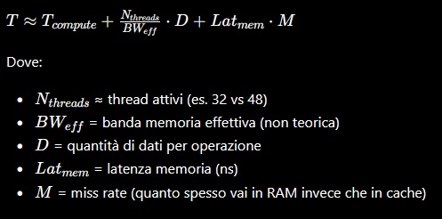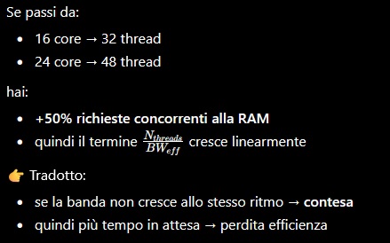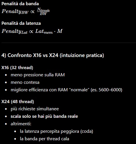 ![]() ![]() ![]() Allora, siccome sto flippando, illustro meglio quello che è il mio pensiero. CCX Zen5 32MB di L3 CCX Zen5 3D 96MB L3. CCX Zen6 48MB L3 CCX Zen6 3D 144MB L3. Gioco X utilizza 6 core 12 TH, così sarà sia su Zen5 che su Zen6. La L3 3D riduce i cache missing, cioè il dato è nella L3 mettiamo nel 95% (valore fittizio) dei casi, quindi il dato viene "letto" dalla L3 a latenze/banda di gran lunga inferiori rispetto ads andarlo a leggere nella DDR5 del sistema. Il dato nella L3 è dipendente dalla bontà della predizione, questo per dire che la dimensione della L3 non può azzerare il cache missing totalmente, quindi ci sarà una riduzione cache missing via via percentualmente inferiore vs la percentuale di aumento della dimensione della L3... ma comunque un miglioramento ci sarà. Questo per arrivare a dire che probabilmente in Zen6 3D ci sarà una dipendenza inferiore alla velocità DDR rispetto a Zen5... nel senso che se un 9850X3D con DDR5 4800 CL40 perde max l'1% di FPS vs lo stesso con DDR5 6000 CL28, avremo che un Zen6 3D con delle DDR5 6000 CL30 perderà ancora meno rispetto ads avere delle DDR5 8000 CL40. Questo nei giochi, FPS, altro punto, in MT. Tutto dipende dal workload soggettivo del programma. Ad esempio, conversione video. Un video di 4GB lo converto in 6 minuti via codec VGA o 12 minuti se elaborato dai core. Ciò vuol dire che avrò una banda in lettura di 4GB in 6/12 minuti ed una banda in scrittura di mettiamo 3GB sempre in 6/12 minuti... totale ~7GB in 6/12minuti... ben distante dai 60GB/s delle DDR5 6000. Ovviamente ci saranno workload molto più intensivi come banda... ma dipende dall'utilizzo. Questo è lo screen di CB24 e CB26 dove rilevo la banda utilizzata. ![]() ![]() Banda DDR5 6000 CL30 ![]() Con un 9950X in PBO2 di 260/270W, con CB24/CB26, non arrivo oltre il 65% dello sfruttamento banda delle DDR5 6000.