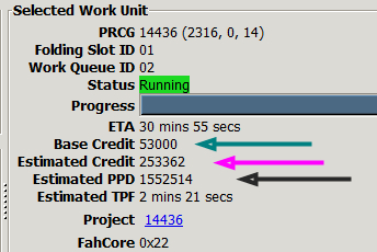 ![]() grazie anche per il contributo con rosetta ![]() ![]() per i punteggi devi innanzitutto aprire il fah-control ![]() qui trovi il base credit, ovvero il punteggio base l'estimated credit, ovvero quanto probabilmente ti verrà assegnato a fine calcolo (solitamente poi il punteggio è un po' inferiore, quanto inferiore dipende da varie cose). Per mia esperienza con 1080ti si va da -2k a -10k punti (ma guardo solo mattina e sera e non sempre quando guardo sta finendo il calcolo ![]() l'estimated ppd, ovvero il punteggio giornaliero se la tua gpu macinasse h24 senza sosta pacchetti identici (stesso bc, stesso ec), diciamo che questo è un valore solo indicativo altri link utili il ns team su f@h https://stats.foldingathome.org/team/246330 il ns team su ocnet https://folding.extremeoverclocking....hp?s=&t=246330 (dove trovi tante più info) buon scaccolamento, felice di averti in nostra compagnia ![]() ciao ciao