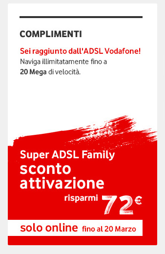 Ragazzi vi segnalo questa ottima offerta! In pratica l'attivazione al posto di costare 3 euro al mese, quindi 108 euro totali, costa solo 36 euro totali, quindi un solo euro al mese!! SOLO per piano Family (chiamate incluse) Conviene approfittarne per chi può, soprattutto visto che di solito ultimamente mettevano a tempo l'offerta per tutta l'attivazione gratuita... però solo per chi NON è cliente vodafone mobile. invece questa attivazione ad 1/3 è valida anche per i clienti vodafone mobile, che quindi possono così cumulare gli sconti! Fino al 20 marzo! Peccato che io non possa approfittarne se non si decidono con sta fibra |