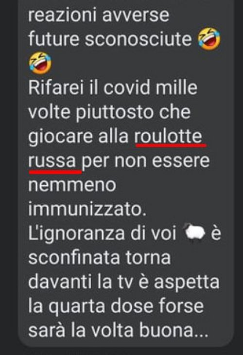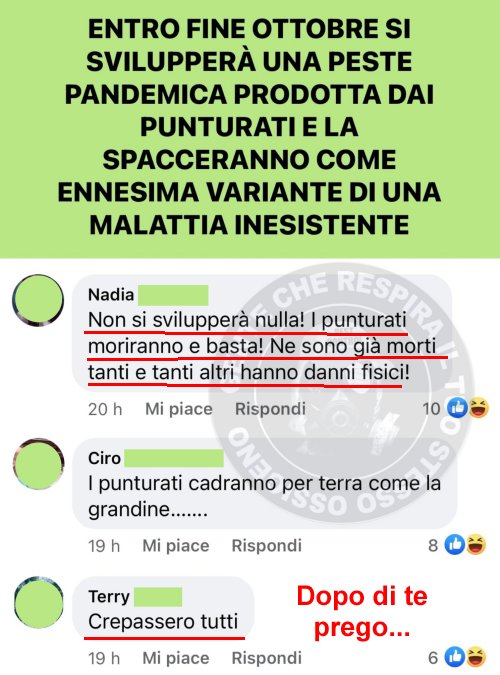 Nel caso l'infetto fosse asintomatico ti ricordo che salvo all'esterno, c'è l'obbligo di mascherina per tutti, e un non vaccinato non può entrare in luoghi dove si può togliere tipo ristorante e palestre. Quindi parli del nulla da buon fasciovax che vorrebbe chiudere in casa tutti quelli che in questo momento stanno rispettando comunque la legge. No, no, ma siete voi la razza superiore hai già lucidato gli stivali di pelle nera? i tuoi commenti velati d'odio sono tra i più ridicoli qua dentro. Chi ti dà manforte è degno tuo compare, ma non vedo molti quote delle tue perle, segno che forse non tutti sono fasciovax come te. Eccolo, dove eri finito? Quote:
