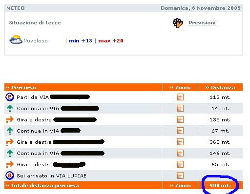 Che poi "percorso pedonale" e' tutto dire... per esempio da casa mia, sia il percorso pedonale che automobilistico danno la stessa distanza, ma in realta' con il percorso pedonale si potrebbe guadagnare circa 200 metri, solo che passa da un'altra strada facendo il giro, e non considera un viottolo da cui si potrebbe tagliare, dal quale ci passa tranquillamente un pedone o un motorino per dire...quindi non si puo' sapere con esattezza il percorso del doppino e non e' detto che sia la distanza giusta quella segnata...cmq meglio di nulla di sicuro, almeno un'idea della distanza uno se la fa Ultima modifica di MiloZ : 02-11-2005 alle 03:14. |