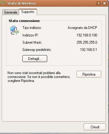 Visto che non sono ben sicuro dove andare a pigliarmi l'ip ti posto un bel ip config /all da dos e un bel doppio clic sull'icona wirelss in basso a dx/supporto.