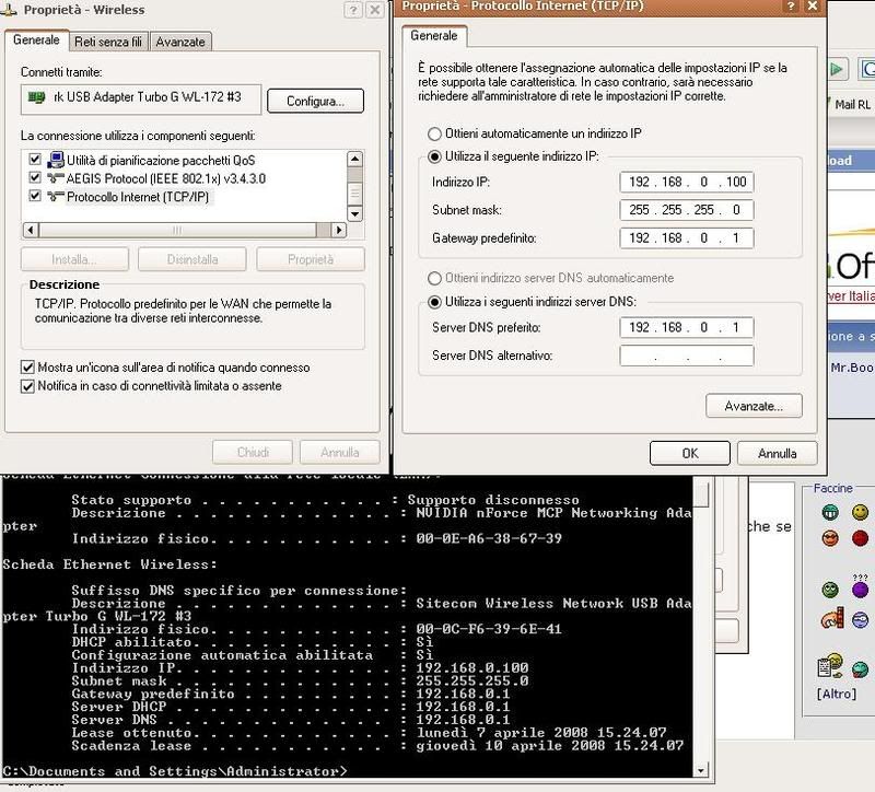 Comunque, su questo intanto segui la guida che ti ho detto prima, e modifica i parametri così: ip 192.168.0.2 subnet 255.255.255.0 gateway 192.168.0.1 dns o l'ip del gateway o i dns del tuo provider. Attendo l'ip config dell'altro ciao |