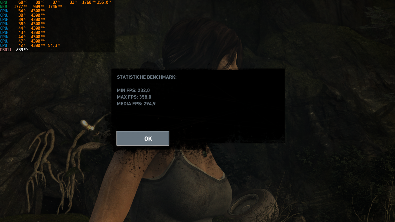 Tutto perfetto. Solo che quando vuoi testare una CPU devi mettere i settaggi a minimo in FHD altrimenti entra in funziona maggiormente la scheda video. Comunque non hai nessun problema di sorta. Gioco vecchio, molti fps e ottimo carico della gpu