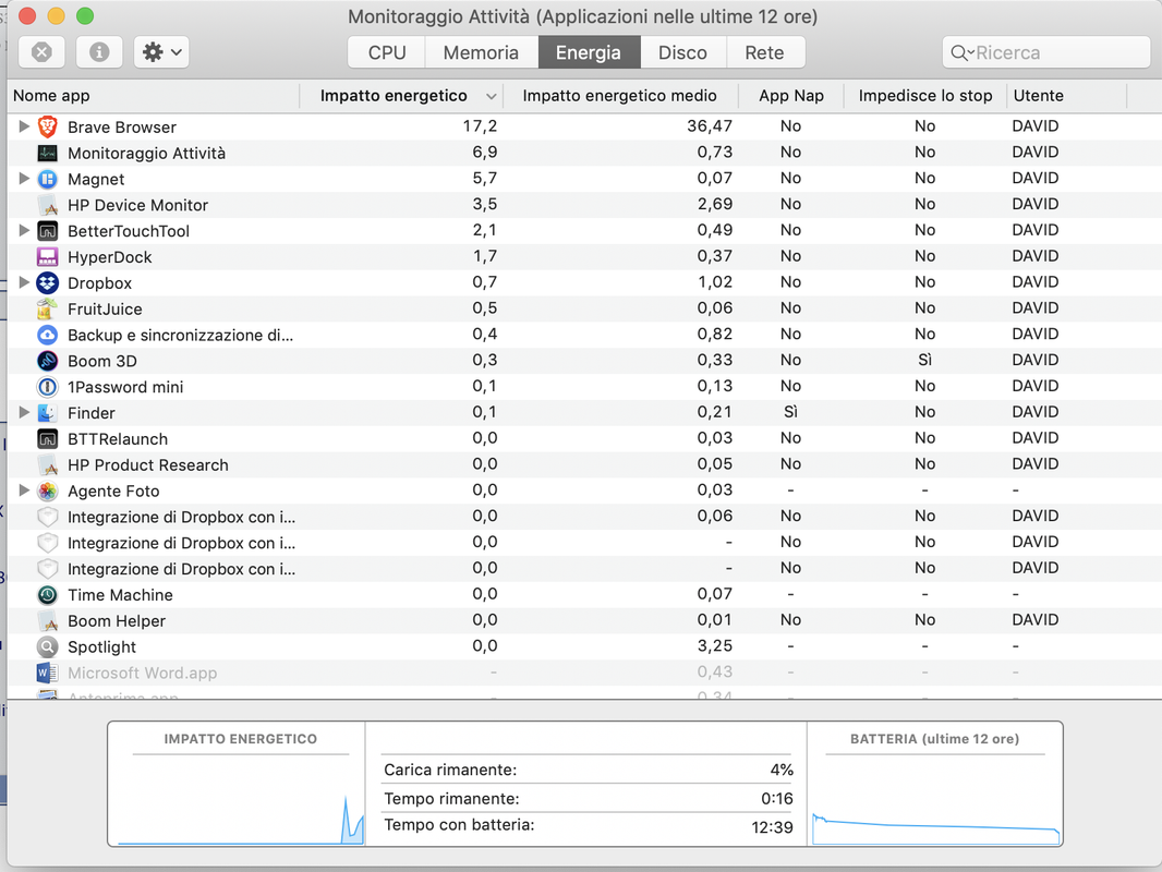 Ho preso in mano il mio MBA 11 minuti fa. Dico 11 minuti fa sul serio.... contati.... Ero al 18% e ora sono a 10%. Uso? SOlo ed esclusivamente lettura e scrittura di questo forum. STOP Possibile non ci sia una app, anche a pagamento, per vedere i singoli processi che consumano energia?