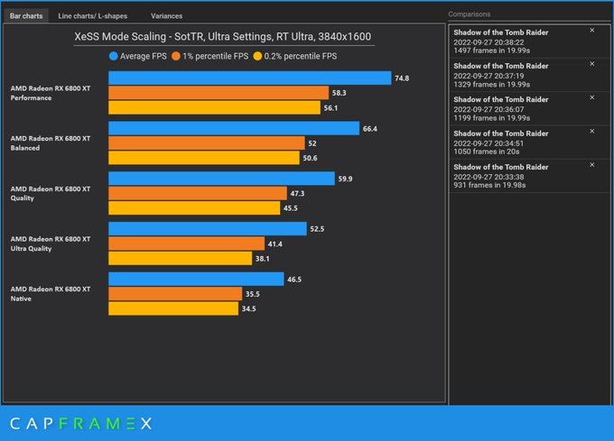 ![]() xess su 6800xt in shadow Native-> Ultra Quality 13% uplift Native-> Quality 29% uplift Native-> Balanced 42% uplift Native-> Performance 61% uplift |
