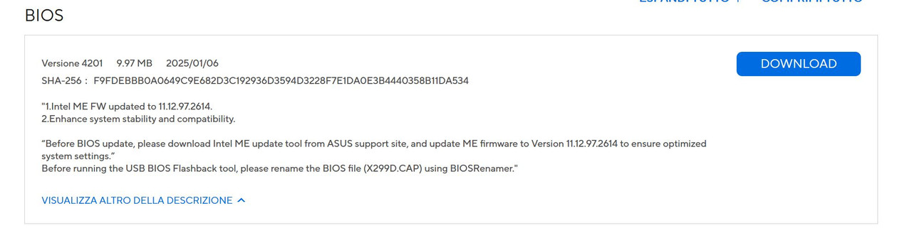 L'unico test che posso fare è andare nel BIOS e modificare qualcosa. Ma se tu mi dici che fare solo questo test avrò una percentuale molto bassa di risolvere il problema, allora non ci vado. ![]() Comunque il BIOS l'ho aggiornato lo scorso anno. Ma non credo che abbia l'ultima versione. Infatti sono andato nel sito ASUS ed ho visto che c'è un UPDAE a Gennaio 2025. Vedi foto. Puoi dirmi dove posso verificare la versione che ho in questo momento? Grazie per il tuo suggerimento, qualcosa già è migliorato. ![]() ![]() Ultima modifica di FoxesHunter : 07-09-2025 alle 17:06. |
