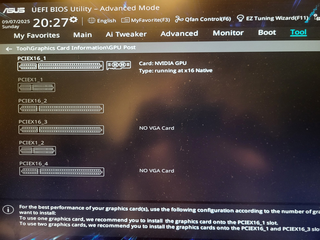 A BIOS aggiornato guarda se trovi una voce riguardo al display, a detta del manuale è sotto Advanced > System Agent, pagina 3-16, dove cita il PEG [PCI-Express Graphics].