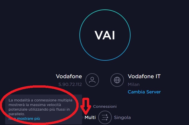 *Ni*: un trasferimento di dati tramite vpn abilita/usa/sfrutta un flusso per volta, per cui con il setting apposito il test Ookla misura la prestazione dal tuo dispositivo a quel server utilizzando un solo flusso, e così "simulando" il throughput atteso di una vpn dal tuo client a quel server.