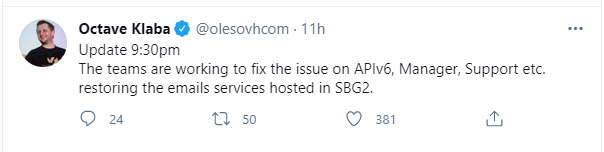Stanno preparando la sala B in SBG5 per poter poi riattivare SBG1-4 e poi il 3. Hanno lavorato nella notte http://travaux.ovh.net/?do=details&id=49484 Per le 10:30 dovrebbe esserci un altro aggiornamento della situazione |