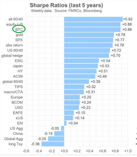 se poi vogliamo ragionare da boomer e commettere l'errore di dire volatilità=rischio, possiamo usare l'indice di Sharpe (https://it.wikipedia.org/wiki/Indice_di_Sharpe ) che classifica un investimento nel rapporto tra rendimento e volatilità. Anche in questo caso, nonostante la volatilità, bitcoin è nella top three degli ultimi 5 anni