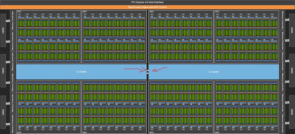 Si infatti parla di una sorta di SLI interno, due GB203 affiancati e comunicanti con un bus dedicato fra loro, in modo da apparire come una unica GPU. Una soluzione che di fatto evita la latenza del bus pci express e le latenze/interferenze di un bus che passa fuori die come avveniva con le schede con due gpu su unico pcb o le schede a panino.