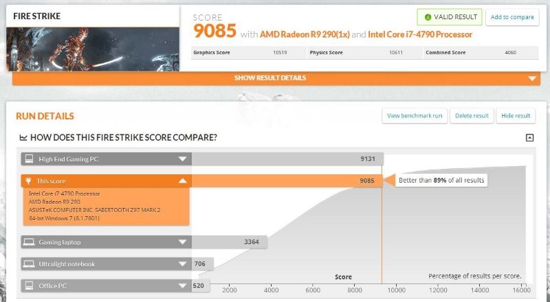 Ecco il mio 3d Mark 13, possiamo vedere subito il confronto tra i processori, visto che la scheda è la stessa (290 tri-x NON OC) ma il mio processore è un i5 4690k NON OC. Se lo linko così riuscite a vederlo?