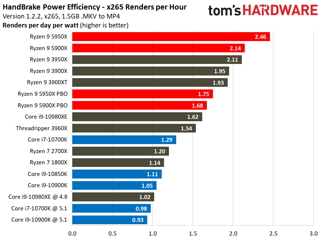 Il 10900k non è direttamente confrontabile e comunque nella recensione di techspot non viene rilevata l'efficienza della cpu. Hai detto che il 10700 è superiore ad un Ryzen di terza generazione, ma ora parli pure di 2700 uscito 1.5 anni prima. Nonostante tutto un 2700x ha un'efficienza simile al 10700k, questo lo si può verificare: ![]() Il 3700x ha un'efficienza superiore, ma di gran lunga. Riporto Handbrake x265, dove le cpu Intel non hanno mai sfigurato, tutt'altro: ![]() tu dici che un 10700 rispetto al 10700k recupera quella differenza di efficienza? Io dico di no. Purtroppo techreport e xbitlabs non fanno più di questi test ormai da tempo, quindi tocca accontentarsi di tomshardware: prendi Blender, Handbrake x265 ed x264 volendo pure Y-cruncher prestazioni/W con le avx512, e verifica caso per caso.