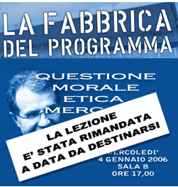 di doman non c'è certezza stiamo qui a mirar la Quercia che s'è persa la corteccia s'è scoperto con Fiorani che Consorte ha fatto breccia mentre a noi solo rimane Fabio Greggio e la sua feccia. |