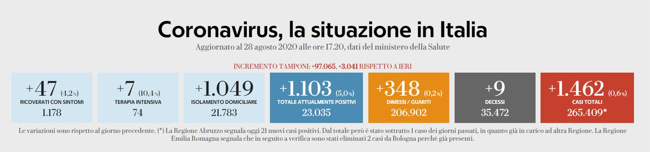 ![]() Ancora in leggero aumento i contagi per il Coronavirus in Italia: sono 1.462 (contro i 1.411 di ieri) quelli registrati nelle ultime 24 ore, nuovo dato più alto dagli inizi di maggio. Sono 9 i morti, invece, in aumento rispetto ai 5 di ieri. I tamponi sono stati 97.065, record per il terzo giorno di fila, secondo i dati del ministero della Salute. I casi totali ammontano ora a 265.409, le vittime complessive a 35.472. Le persone attualmente positive sono ora 23.035, con un incremento di 1.103 in 24 ore. I guariti sono 206.902, 348 in più. Spicca l'incremento dei pazienti in terapia intensiva, +7 per un totale di 74. I ricoverati con sintomi sono 47 in più (1.178), aumentano invece ancora di 1.049 i pazienti in isolamento domiciliare (21.783 il totale). Anche oggi nessuna regione fa registrare zero nuovi casi nelle ultime 24 ore. In testa per positivi trovati di nuovo nettamente la Lombardia con 316, seguita dalla Campania con 183, dal Lazio con 166, Emilia Romagna 164, a 135 il Veneto. Il Piemonte ne fa registrare 91, la Toscana 82, la Sardegna 55, la Sicilia 54. Chiude la classifica odierna dei nuovi positivi il Molise con un solo caso. FRIULI VENEZIA GIULIA Le persone attualmente positive al coronavirus in Friuli Venezia Giulia sono 354 (12 più di ieri). Nessun paziente risulta in cura in terapia intensiva, mentre 13 sono ricoverati in altri reparti. Non si sono registrati nuovi decessi (348 in totale). Lo ha comunicato il vicegovernatore con delega alla Salute. Oggi sono stati rilevati 19 nuovi contagi; quindi, analizzando i dati complessivi dall'inizio dell'epidemia, le persone risultate positive al virus sono 3.728: 1.473 a Trieste, 1.171 a Udine, 820 a Pordenone e 256 a Gorizia, alle quali si aggiungono 8 persone da fuori regione. I totalmente guariti ammontano a 3.026, i clinicamente guariti sono 7 e le persone in isolamento 334. I deceduti sono 197 a Trieste, 77 a Udine, 68 a Pordenone e 6 a Gorizia. VENETO Sono 135 i nuovi casi di positività al Coronavirus in Veneto, per un dato complessivo dall'inizio dell'epidemia che raggiunge i 22.604 infetti. Si registrano nelle ultime 24 ore anche due vittime, per un conteggio totale di 2.119 morti (tra ospedali e case di riposo). Lo rende noto il bollettino della Regione. Con i nuovi focolai sul territorio si registra oggi un altro boom dei soggetti in isolamento, +1.074, per un dato complessivo di 8.110 (126 dei quali con sintomi). Si tratta però di un incremento - spiega la sanità regionale - che risente di un caricamento massivo di dati riguardanti viaggiatori sottoposti a tampone dall'Ulss di Verona, provincia in cui le persone in isolamento sono ora 2.307. I soggetti attualmente positivi in Veneto sono 2.253.TOSCANA In Toscana sono 11.595 i casi di positività al Coronavirus, 82 in più rispetto a ieri (17 identificati in corso di tracciamento e 65 da attività di screening). I nuovi casi sono lo 0,7% in più rispetto al totale del giorno precedente. L'età media degli 82 casi odierni è di 35 anni circa (il 32% ha meno di 26 anni, il 36% tra 26 e 40 anni, il 23% tra 41 e 65 anni, il 9% ha più di 65 anni) e, per quanto riguarda gli stati clinici, il 67% è risultato asintomatico, il 20% pauci-sintomatico. Delle 82 positività odierne, 20 casi sono ricollegabili a rientri dall'estero, di cui 9 per motivi di vacanza (5 Grecia, 3 Spagna, 1 Croazia). 16 casi sono ricollegabili a rientri da altre regioni italiane (11 Sardegna, 5 altro). 2 casi riferibili a cittadini residenti fuori regione la cui positività è stata notificata in Toscana. ABRUZZO "Sono complessivamente 3725 i casi positivi al Covid 19 registrati in Abruzzo dall'inizio dell'emergenza. Rispetto a ieri si registrano 20 nuovi casi (di età compresa tra 8 e 71 anni), mentre il numero dei pazienti deceduti resta fermo a 472". Lo comunica l'Assessorato alla Sanità della Regione Abruzzo. "Nel numero dei casi positivi sono compresi anche 2870 dimessi/guariti (+18 rispetto a ieri, di cui 14 che da sintomatici con manifestazioni cliniche associate al Covid 19, sono diventati asintomatici e 2856 che hanno cioè risolto i sintomi dell'infezione e sono risultati negativi in due test consecutivi). Gli attualmente positivi in Abruzzo (calcolati sottraendo al totale dei positivi, il numero dei dimessi/guariti e dei deceduti) sono 383 (+2 rispetto a ieri). Dall'inizio dell'emergenza Coronavirus, sono stati eseguiti complessivamente 153133 test". "Sono 39 i pazienti (+2 rispetto a ieri) ricoverati in ospedale in terapia non intensiva; 1 (invariato rispetto a ieri) in terapia intensiva, mentre gli altri 343 (invariato rispetto a ieri) sono in isolamento domiciliare con sorveglianza attiva da parte delle Asl. Del totale dei casi positivi, 388 sono residenti o domiciliati in provincia dell'Aquila (+11 rispetto a ieri), 905 in provincia di Chieti (+1), 1686 in provincia di Pescara (+4), 710 in provincia di Teramo (+4), 31 fuori regione e 5 per i quali sono in corso verifiche sulla provenienza". MARCHE Torna ad essere occupato un posto di Terapia intensiva nelle Marche, a causa del coronavirus. Il Gores infatti comunica che i contagi sono saliti a 7.211 (+17): 5.933 dimessi/guariti (+9), 282 in isolamento domiciliare (+7) e nove ricoverati (+1). Tra quest'ultimi un paziente è in terapia intensiva al torrette di ancona mentre gli altri otto sono tutti in reparti non intensivi: sei a malattie infettive a torrette, uno a malattie infettive del san salvatore di pesaro ed un'altra paziente nel reparto di ostetricia-ginecologia dell'ospedale pesarese. Il territorio più colpito è Pesaro Urbino con 2.931 casi positivi (+8), segue Ancona con 1.933 (=), Macerata 1.212 (+4), Fermo 516 (+1) e Ascoli Piceno 355 (+3). Forte aumento dei casi/contatti in isolamento domiciliare che oggi sono 2.145 (+186) tra cui 78 operatori sanitari: 601 ad Ancona (+29), 699 a Pesaro Urbino (+45), 290 a Macerata (+12), 305 a Fermo (+93) e 250 ad Ascoli Piceno (+7).LAZIO "Oggi nel Lazio si registrano 166 casi 