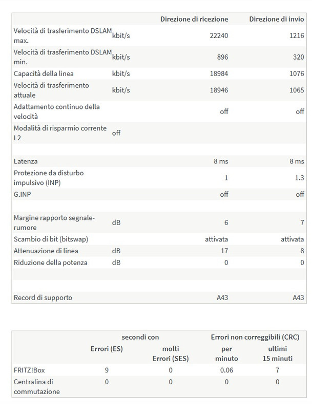 Io prevalentemente gioco online quindi mi servono latenze basse, ora non capisco se sia meglio avere 15 in download con zero errori o pochi contro un 18 e tanti. Per quanto riguarda disconnessioni o cadute di portante non ne ho nemmeno con snr a 1, senza la modifica con FBeditor comunque stavo al massimo a 6