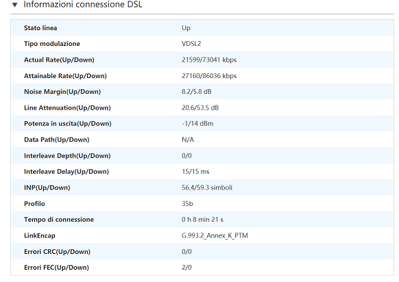 Resetta il modem, stacca la linea, configuralo. Nella connessione devi solo selezionare Internet e Voip, lascia disattivato TR69 e IPTV. Hai fatto bene per ottenere la chiave VoIP, serve la linea attiva per averla. A modem sbloccato vai nella configurazione del VoIP e metti tuo nome utente (num telefonico comprensivo di +39) e la chiave Voip come password, funzionerà immediatamente. Con 21db di attenuazione e linea pulita agganceresti oltre i 200mb (anche 250/260mbps). Cerca di trovare il problema in casa/palazzina. |
