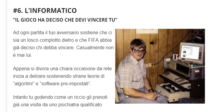 Ti basti sapere che non bisogna essere "informatici" per intuire una tendenza statistica preoccupante. A tuo dire, allora, tutta quelli che la pensano come me, ossia un intero subreddit su FUT (centinaia di utenti), abbiano bisogno di una visita di uno psichiatra qualificato. Ti sei invece mai chiesto come mai, invece, tu sei uno degli sparuti "illuminati" filosofi che crede sia tutto inventato? Direi che è decisamente più conveniente credere che siano la restante maggior parte a necessitare di psicanalisi ![]() Intelligenti pauca, amico mio.