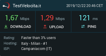Da me icaro sempre 2 mega ma non è un problema domani quando il tempo migliora, tolgo la sim icaro e provo a prendere vodafone, che pare avere aumentato le sue performance qui... |
