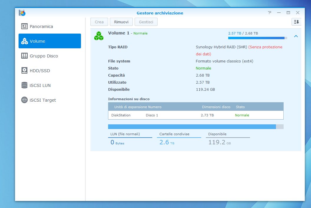 Se hai un disco solo ti dice quello. A me, via browser, dice invece, sotto volume 1: SHR, btrfs. Perché non vuoi provare dalla app?