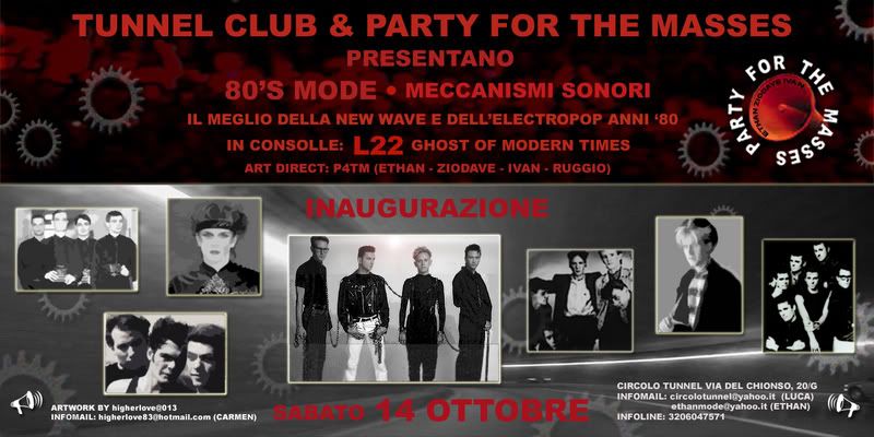 vi informo che sabato 14 ottobre presso la disco "Tunnel" di Reggio Emilia si inaugura l' "80's Mode", serata interamente dedicata alla miglior new wave e techno pop degli anni 80. La serata è organizzata da "Party for The Masses" e alla console ci sarà L22. se siete appassionati del genere ![]() Il "Tunnel" si trova a Reggio Emilia in via del Chionso 20/g, e per l'ingresso bisogna essere tesserati ARCI (per chi ne è sprovvisto può sempre far la tessera all'ingresso del locale..) Ultima modifica di roller18 : 10-11-2006 alle 21:00. |