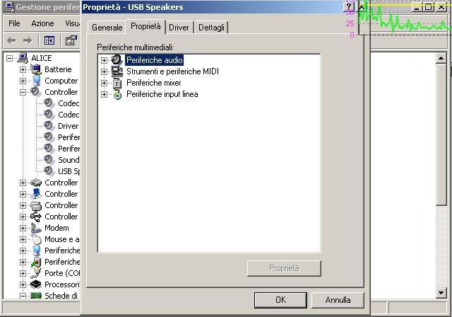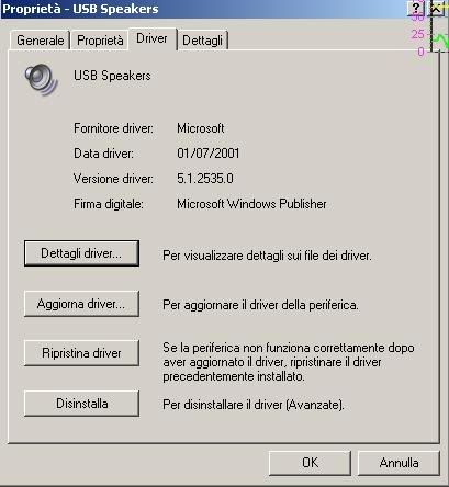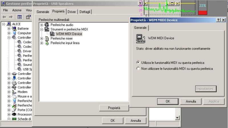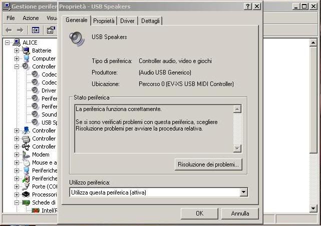 l'ho collegata al portatile ibm x40 tramite usb windows xp trova la periferica e la installa automaticamente come usb speaker (ma quelli che la usano e gli funziona dicono che sia installata allo stesso modo) ma la tastiera non è vista da nessun programma di musica come reason o ableton live ho guardato nella gestione periferiche --> controller, audio, video e giochi e ho visto che tutti i driver nelle propietà dicono driver abilitato ma non funzionante correttamente screen shot 1 screen shot 2 grazie a tutti per l'aiuto kisses, alice |
