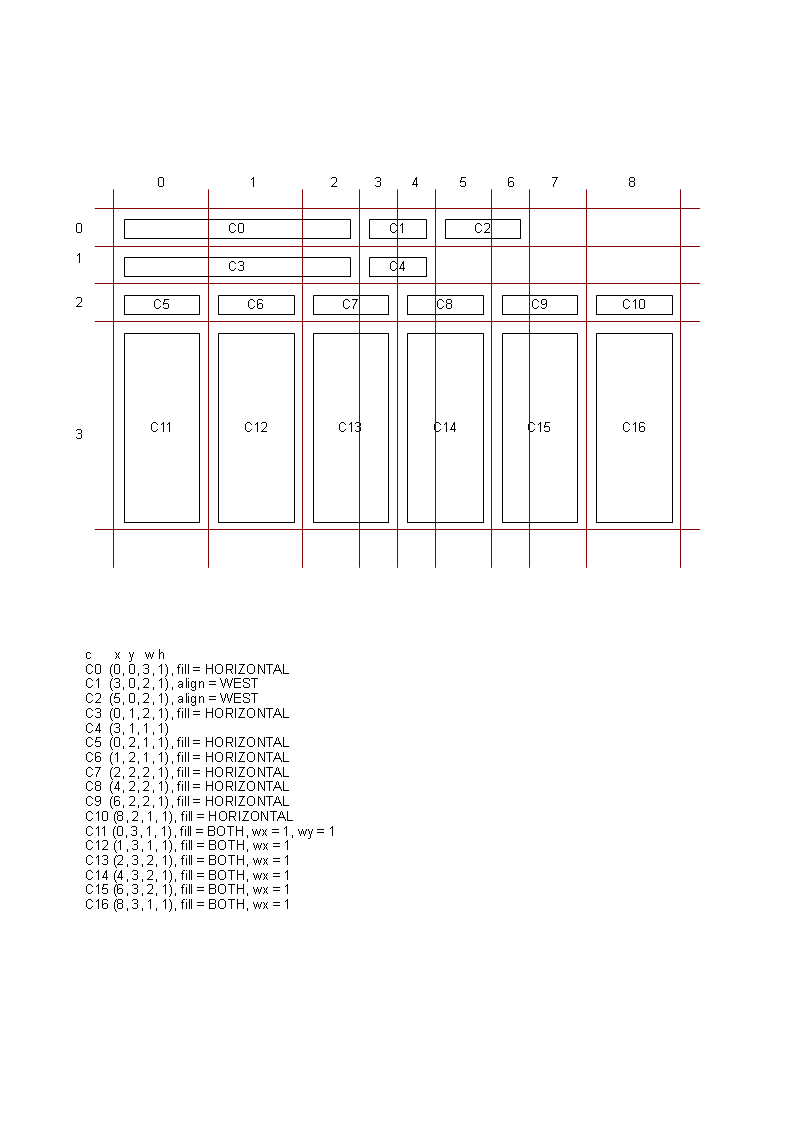 ![]() Lo schema è la chiave di GridBagLayout, una volta che ce l'hai devi solo battere dei numeri.