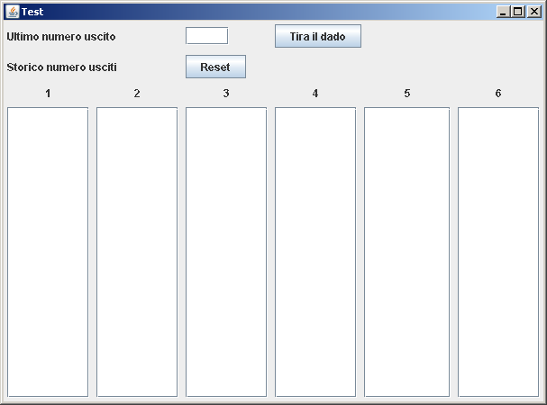 ![]() cliccando su "TIRA" simulo il tiro di un dado generando casualmente un numero compreso tra 1 e 6. Ogni JTextArea tiene traccia dei numeri usciti e ogni volta che esce il rispettivo numero scrive nella relativa area il numero di giro a cui esce. Con "RESET" cancello lo storico dei numeri e torno alla situazione iniziale. Ora, non riesco a riprodurre il Layout (sto usando come LAyout Manager il GridBagLayout) e non riesco nemmeno a fare in modo che il testo delle colonne sia allineato in cima e che il numero di tiro in cui esce ogni numero si scriva sotto e non sostituisca il numero iniziale. Vi copio il codice: Codice:
