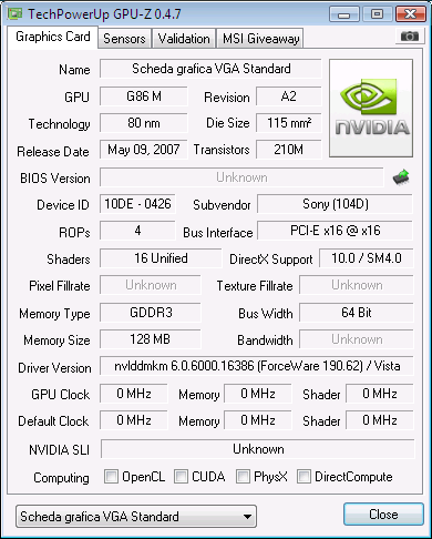 Ho un notebook sony vaio vgn-nr21z con scheda video NVIDIA GeForce 8400M GT GPU ma non riesco ad installare i driver nvidia (l'installazione mi dice che l'hardware non è compatibile) e ilsistema mi dice che lascheda video è "scheda grafica VGA standard"!...che posso fare per risolvere il problema e installare i driver corretti???